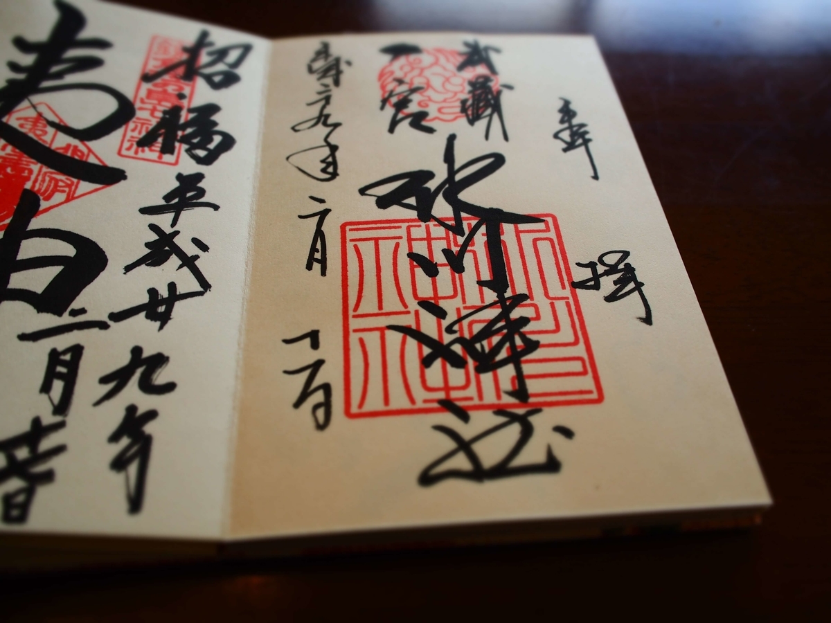 大宮の武蔵一宮氷川神社では流れるような書体の美しい御朱印を頂けます。約2㎞あるとされる参道は日本一の長さで、境内は神秘的雰囲気に満ちたパワースポットでした。